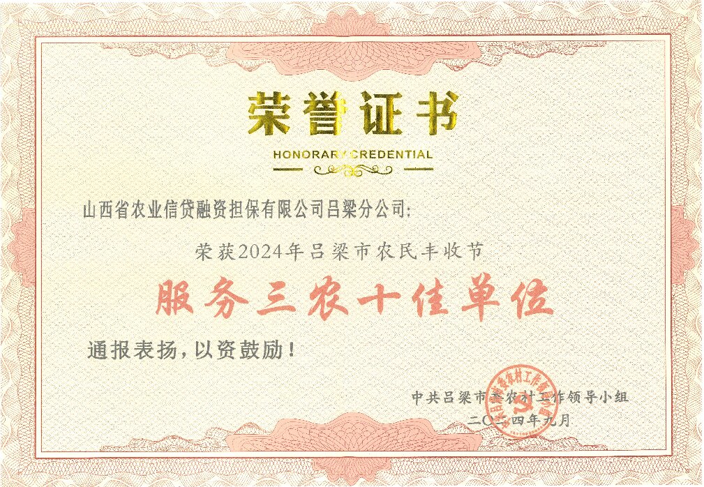 山西農(nóng)擔(dān)呂梁分公司榮獲2024年呂梁市農(nóng)民豐收節(jié)“服務(wù)三農(nóng)十佳單位”稱號(hào)