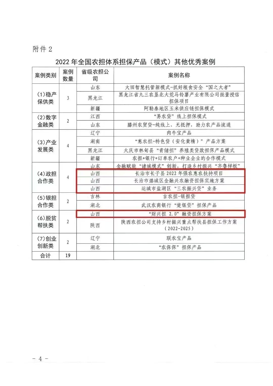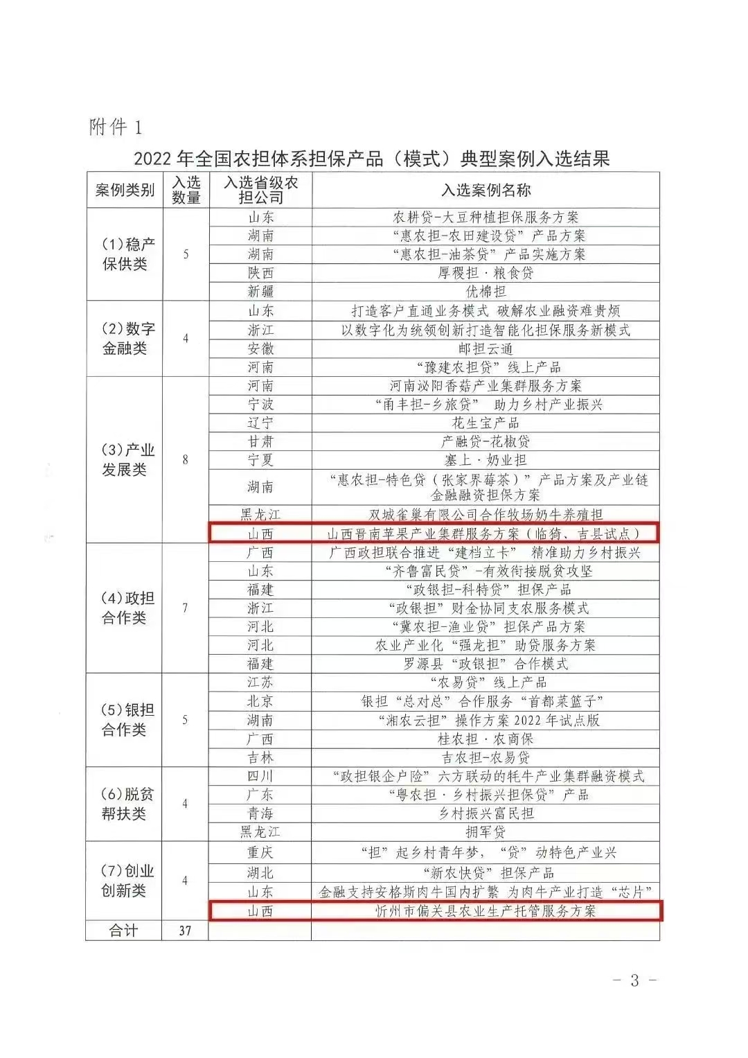 1月3日,國家農(nóng)擔(dān)公司公布了《關(guān)于全國農(nóng)擔(dān)體系擔(dān)保產(chǎn)品(模式)案例(2022年)評審結(jié)果的通知》(國農(nóng)擔(dān)〔2023〕1號),根據(jù)通知,山西農(nóng)擔(dān)公司“晉南蘋果產(chǎn)業(yè)集群服務(wù)方案”“忻州市偏關(guān)縣農(nóng)業(yè)生產(chǎn)托管服務(wù)方案”兩個案例分別入選產(chǎn)業(yè)發(fā)展類、創(chuàng)業(yè)創(chuàng)新類典型案例,“長子縣強(qiáng)農(nóng)惠農(nóng)扶持項目”“潞城區(qū)金融興農(nóng)融資擔(dān)保方案”“鹽湖區(qū)三農(nóng)振興貸業(yè)務(wù)”“財興擔(dān)2.0融資擔(dān)保方案”4個案例分別入選政擔(dān)合作類、脫貧幫扶類優(yōu)秀案例,入選案例數(shù)在全國33家省級農(nóng)擔(dān)公司中排名第二。